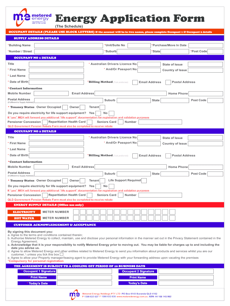 Energy Application Form (The Schedule) OCCUPANT DETAILS (PLEASE USE BLOCK LETTERS) If the account will be in two names, please complete Occupant 1 & Occupant 2 details SUPPLY ADDRESS DETAILS *Building