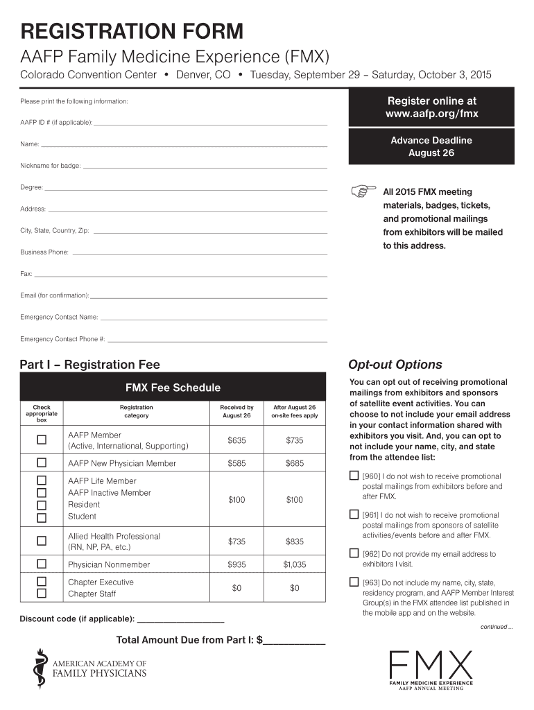 REGISTRATION FORM AAF Family Medicine Experience (FM) Colorado Convention Center Denver, CO Tuesday, September 29 Saturday, October 3, 2015, Register online at www.aafp.org/fmx Please print the following