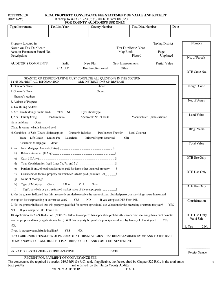 REAL PROPERTY CONVEYANCE FEE STATEMENT OF VALUE AND RECEIPT DUE FORM 100 (REV 12/98) If exempt by O.R.C. 319.54 (F) (3), Use DUE Form 100 (EX) FOR COUNTY AUDITORS USE ONLY Tax List Year County Number