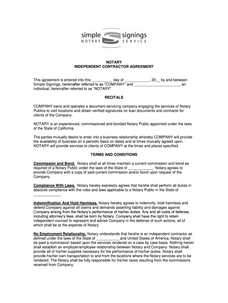 NOTARY INDEPENDENT CONTRACTOR AGREEMENT This agreement is entered into this day of, 20 by and between Simple Signings, hereinafter referred to as COMPANY and, an individual, hereinafter referred to