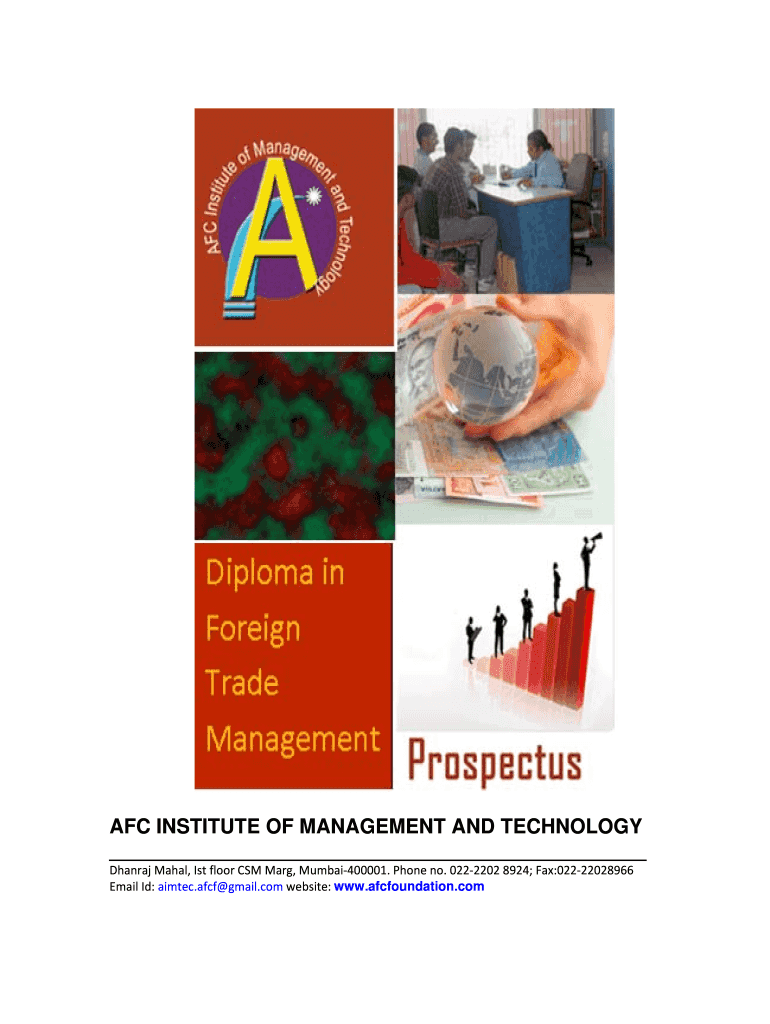 AFC INSTITUTE OF MANAGEMENT AND TECHNOLOGY DhanrajMahal, IstfloorCSMMarg,Mumbai400001. Phone no.02222028924;Fax:02222028966 Emailed:aimed.AFC Gmail.com website:www.afcfoundation.com About AIM TEC