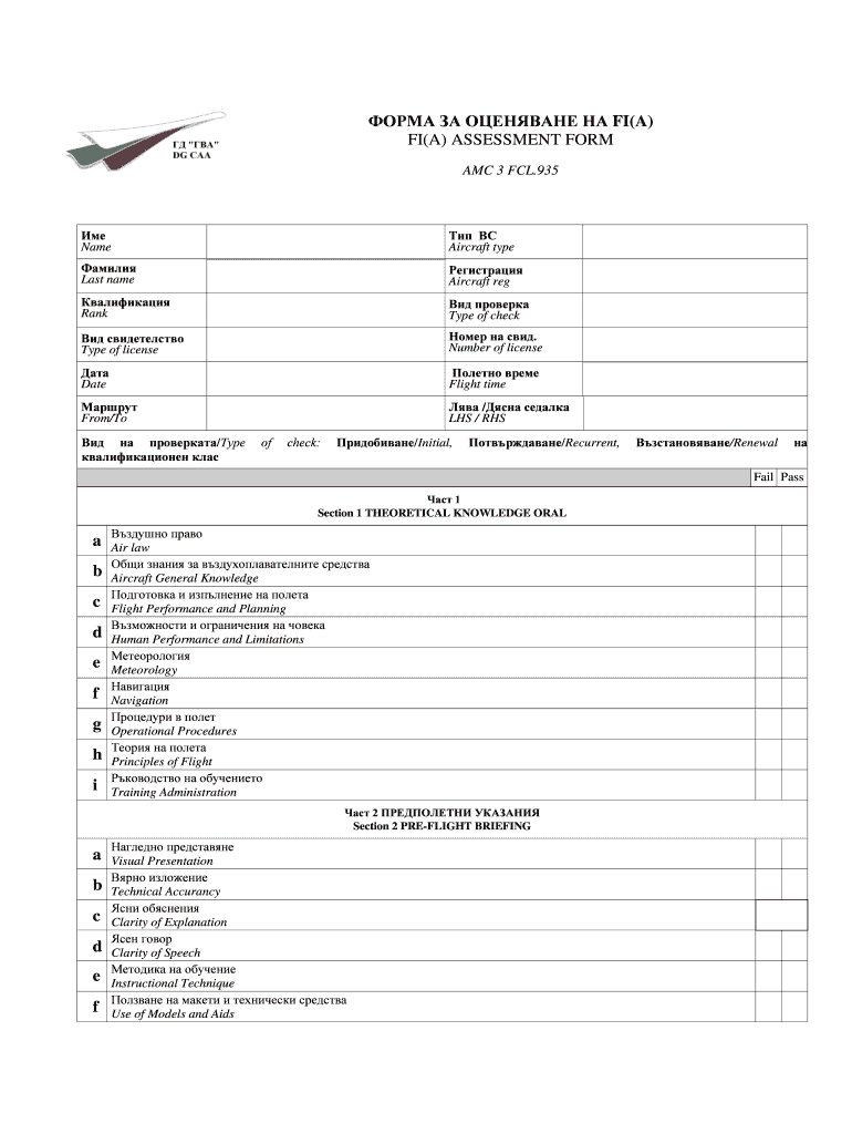 FI(A) FI(A) ASSESSMENT FORM AMC 3 FCL.935 Name Aircraft type Last name Aircraft reg Rank Type of check Type of license. Number of license Date Flight time From/To / LHS / RHS /TP.
