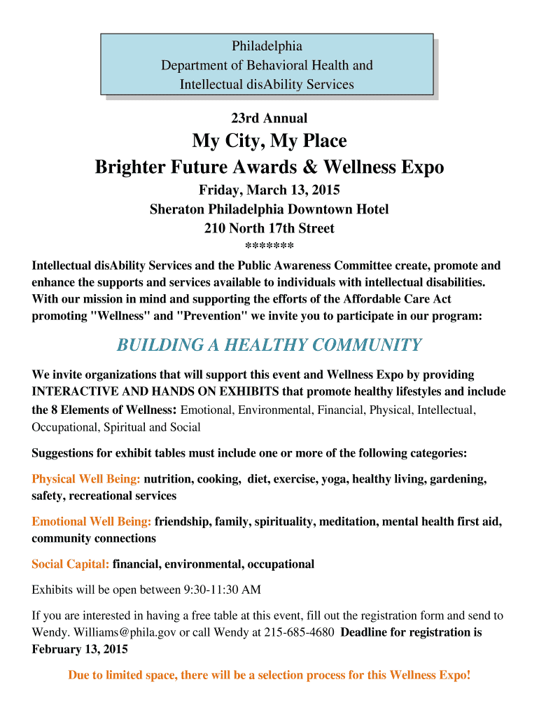 Philadelphia Department of Behavioral Health and Intellectual disability Services 23rd Annual My City, My Place Brighter Future Awards & Wellness Expo Friday, March 13, 2015, Sheraton Philadelphia