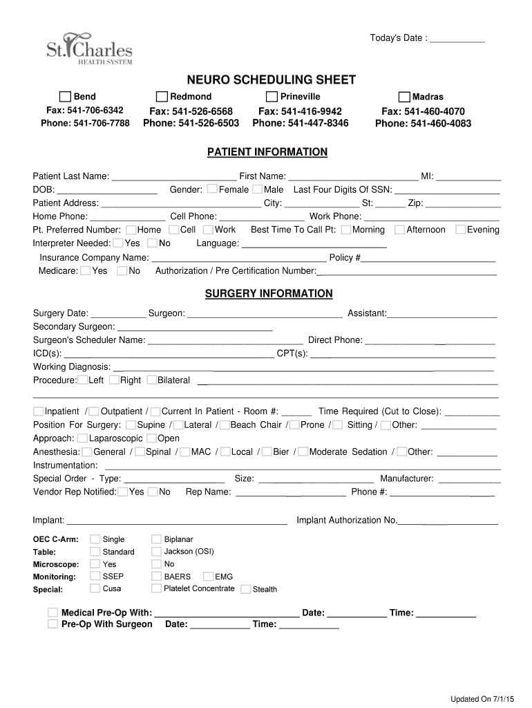 Get the free NEURO SCHEDULING SHEET - St Charles Clinic