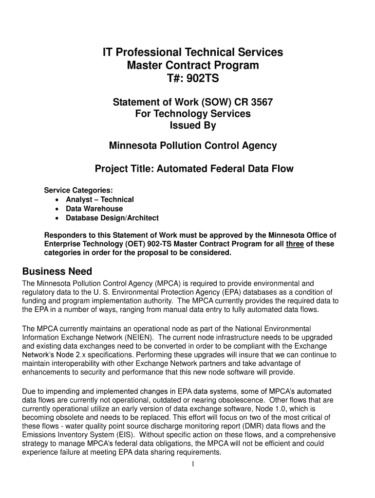 IT Professional Technical Services Master Contract Program T#: 902TS Statement of Work (SOW) CR 3567 For Technology Services Issued By Minnesota Pollution Control Agency Project Title: Automated Federal