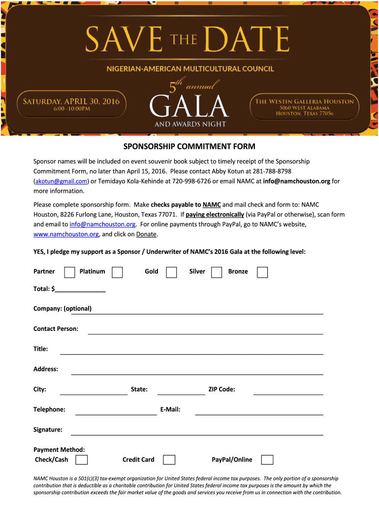 Nigerian American Multicultural Council (NAMC) Email: info namchouston.org 8226 Furlong Lane, Houston, TX 77071 Website: www.namchouston.org April 1, 2016, Invitation to Sponsor the Nigerian American