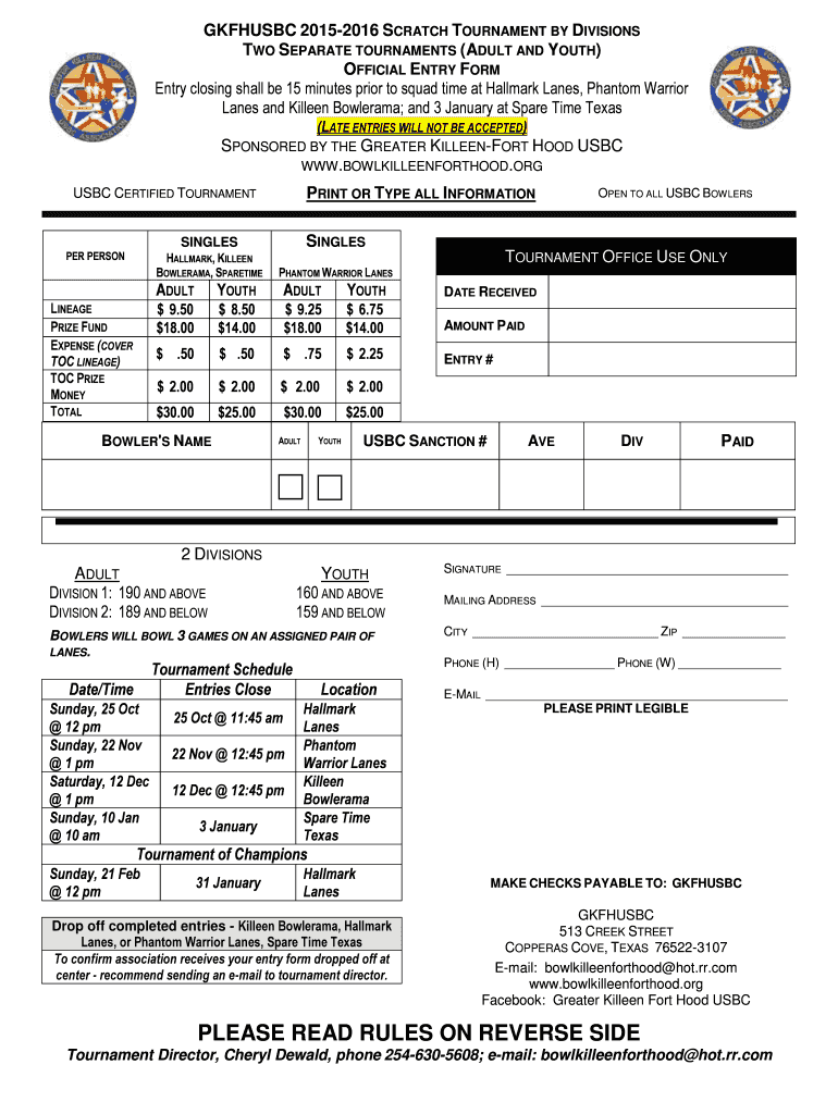 GKFHUSBC 20152016 SCRATCH TOURNAMENT BY DIVISIONS TWO SEPARATE TOURNAMENTS (ADULT AND YOUTH) OFFICIAL ENTRY FORM Entry closing shall be 15 minutes prior to squad time at Hallmark Lanes, Phantom Warrior
