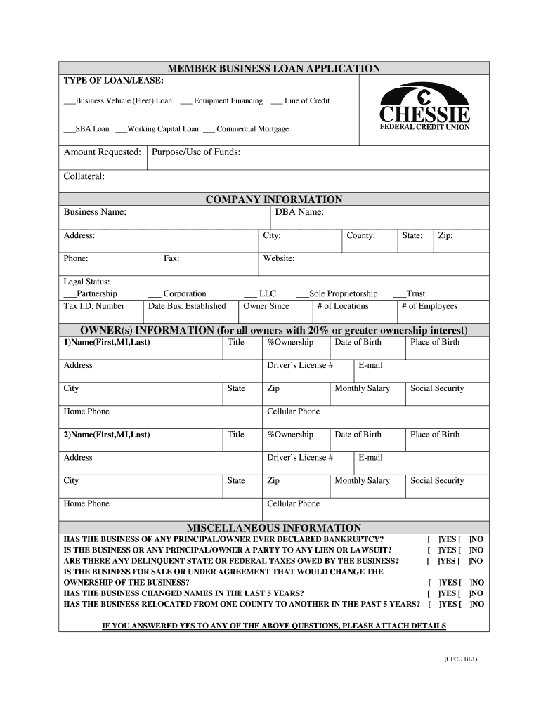 Get the free BUSINESS LOAN APPLICATION - Chessie Federal Credit Union - chessiefcu
