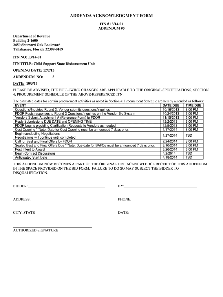 ADDENDA ACKNOWLEDGMENT FORM ITN # 13/1401 ADDENDUM #5 Department of Revenue Building 21600 2450 Shepard Oak Boulevard Tallahassee, Florida 323990109 ITN NO: 13/1401 ITN TITLE: Child Support State