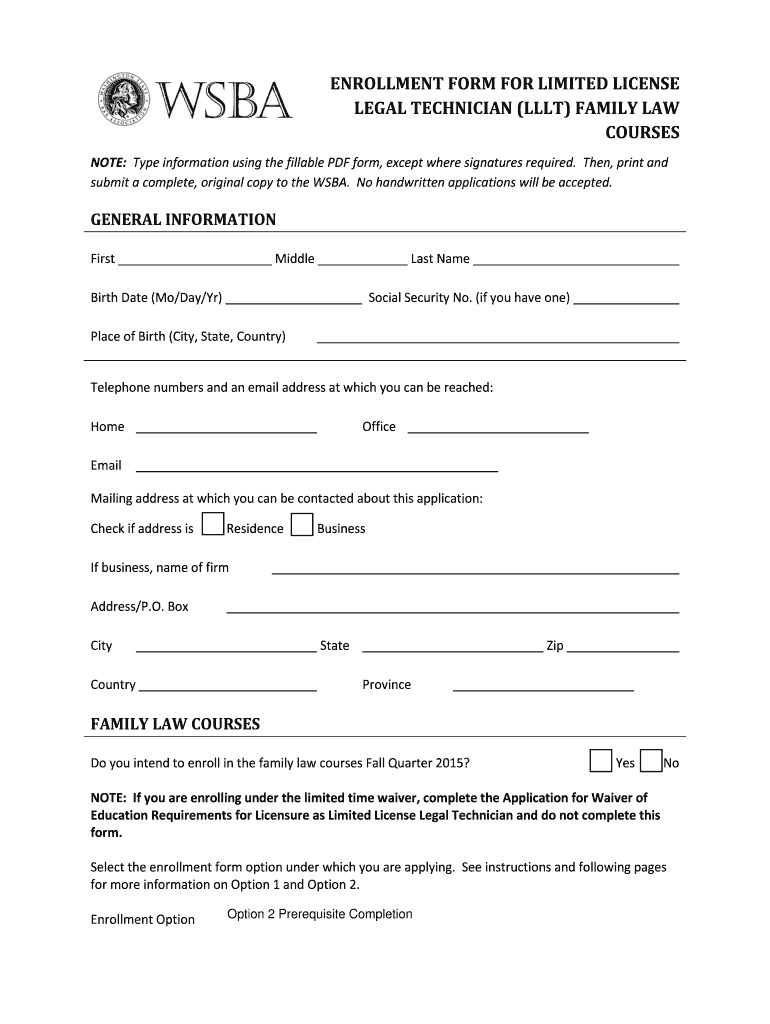 ENROLLMENT FORM FOR LIMITED LICENSE LEGAL TECHNICIAN (LILT) FAMILY LAW COURSES NOTE: Type information using the fillable PDF form, except where signatures required. Then, print and submit a complete,
