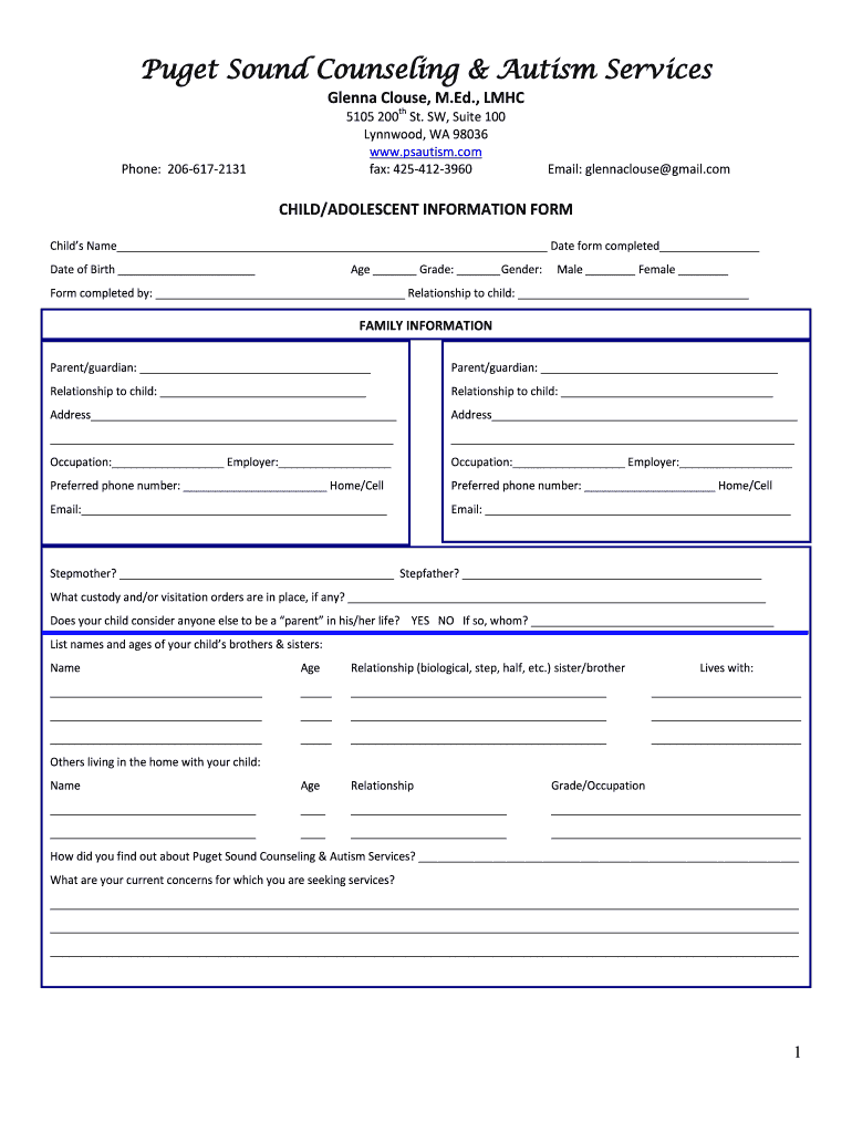 Puget Sound Counseling & Autism Services Glenna Close, M. Ed., MHC TH 5105 200 St. SW, Suite 100 Lynnwood, WA 98036 www.psautism.com fax: 4254123960 Phone: 2066172131 Email: glennaclouse gmail.com