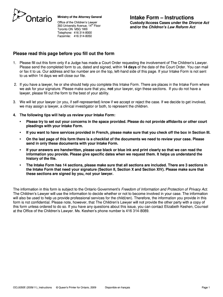 Ministry of the Attorney General Intake Form Instructions Office of the Children's Lawyer 393 University Avenue, 14th Floor Toronto ON M5G 1W9 Telephone: 416 3148000 Facsimiles: 416 3148050 Custody/Access
