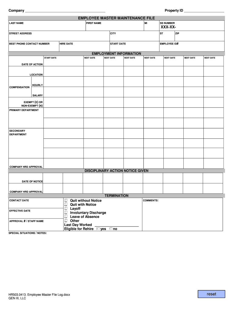 Company Property ID EMPLOYEE MASTER MAINTENANCE FILE LAST NAME FIRST NAME MI SS NUMBER XXXXXSTREET ADDRESS CITY BEST PHONE CONTACT NUMBER START DATE HIRE DATE ST ZIP EMPLOYEE ID# EMPLOYMENT INFORMATION