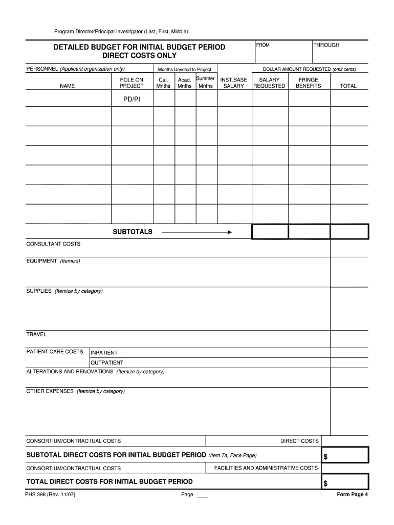 Get the free PHS 398 fp4 Rev 1107 Detailed Budget for Initial Budget Period Form Page 4 - chicago...