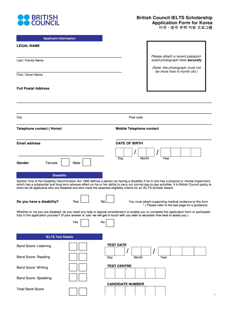 British Council IELTS Scholarship Application Form for Korea Applicant Information LEGAL NAME Please attach a recent passport sized photograph here securely Last / Family Name (Note: the photograph