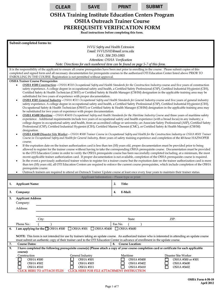 SAVE CLEAR SUBMIT PRINT OSHA Training Institute Education Centers Program OSHA Outreach Trainer Course PREREQUISITE VERIFICATION FORM Read instructions before completing this form. Submit completed