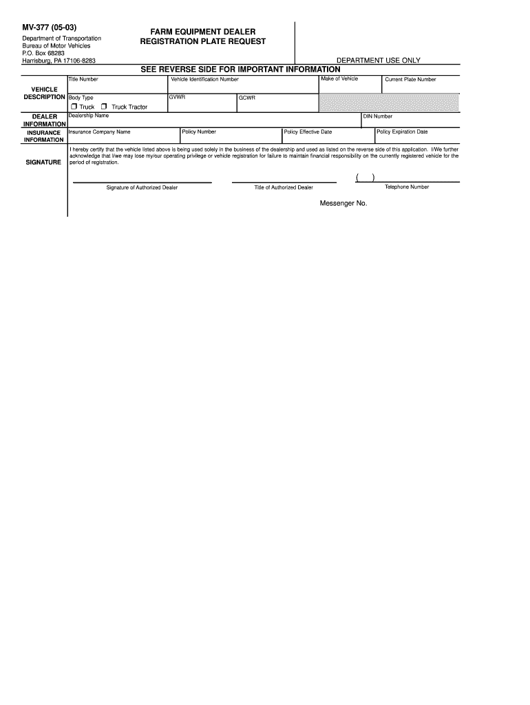MV377 (0503) FARM EQUIPMENT DEALER REGISTRATION PLATE REQUEST Department of Transportation Bureau of Motor Vehicles P.O. Box 68283 Harrisburg, PA 171068283 DEPARTMENT USE ONLY SEE REVERSE SIDE FOR