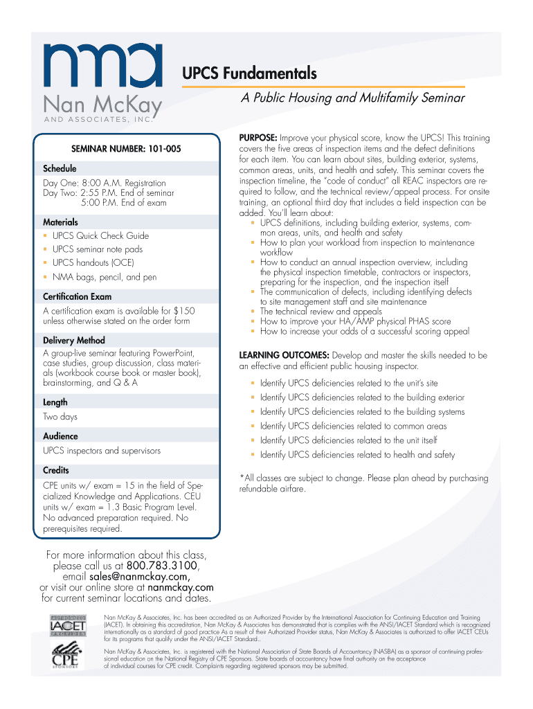 UPCs Fundamentals A Public Housing and Multifamily SeminarSEMINAR NUMBER: 101005 Schedule Day One: 8:00 A.M. Registration Day Two: 2:55 P.M. End of seminar 5:00 P.M. End of exam Materials UPCs Quick