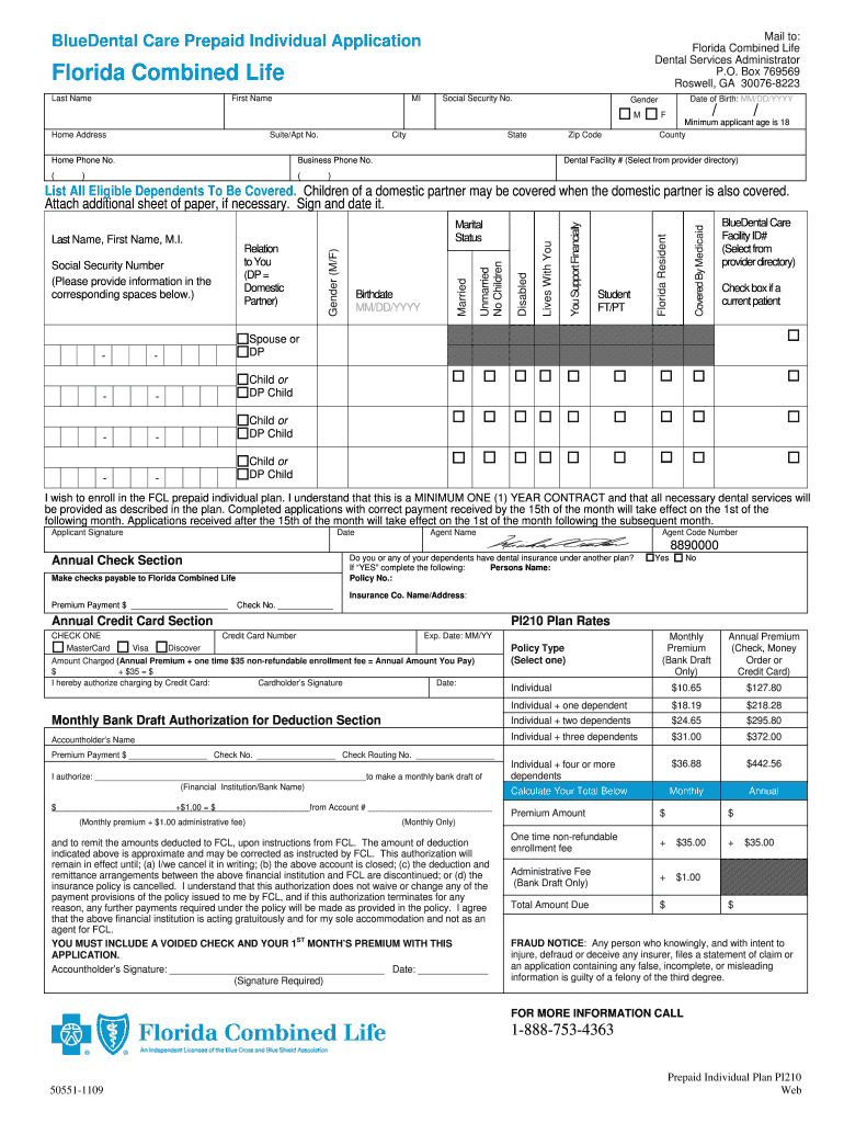This document is an application form for the BlueDental Care Prepaid Individual Plan provided by Florida Combined Life, allowing individuals to enroll in dental services.