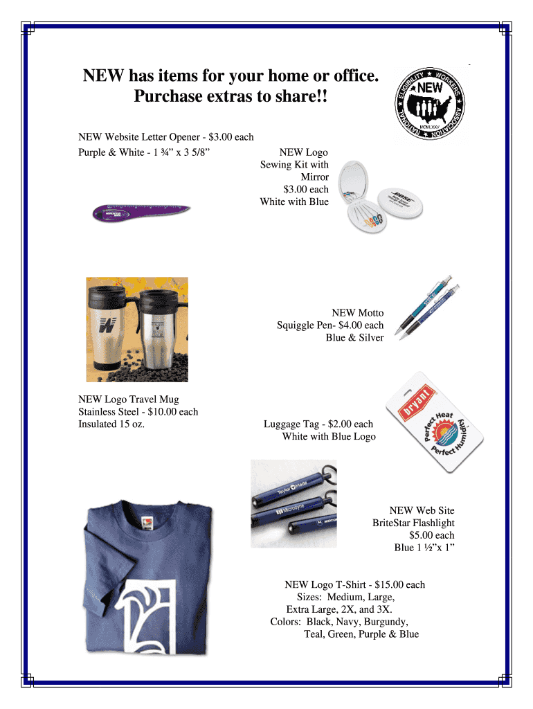 NEW has items for your home or office. Purchase extras to share!! NEW Website Letter Opener $3.00 each Purple & White 1 3 5/8 NEW Logo Sewing Kit with Mirror $3.00 each White with Blue NEW Motto Squiggle