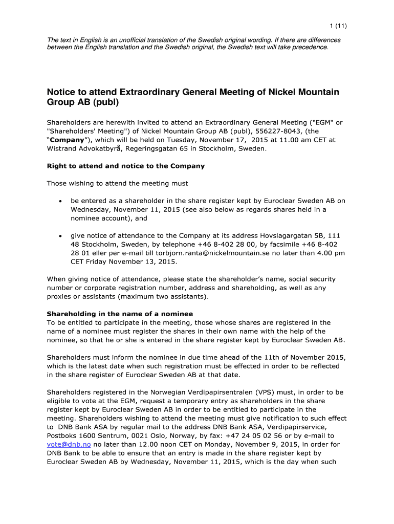Get the free Notice to attend Extraordinary General Meeting of Nickel - nickelmountain