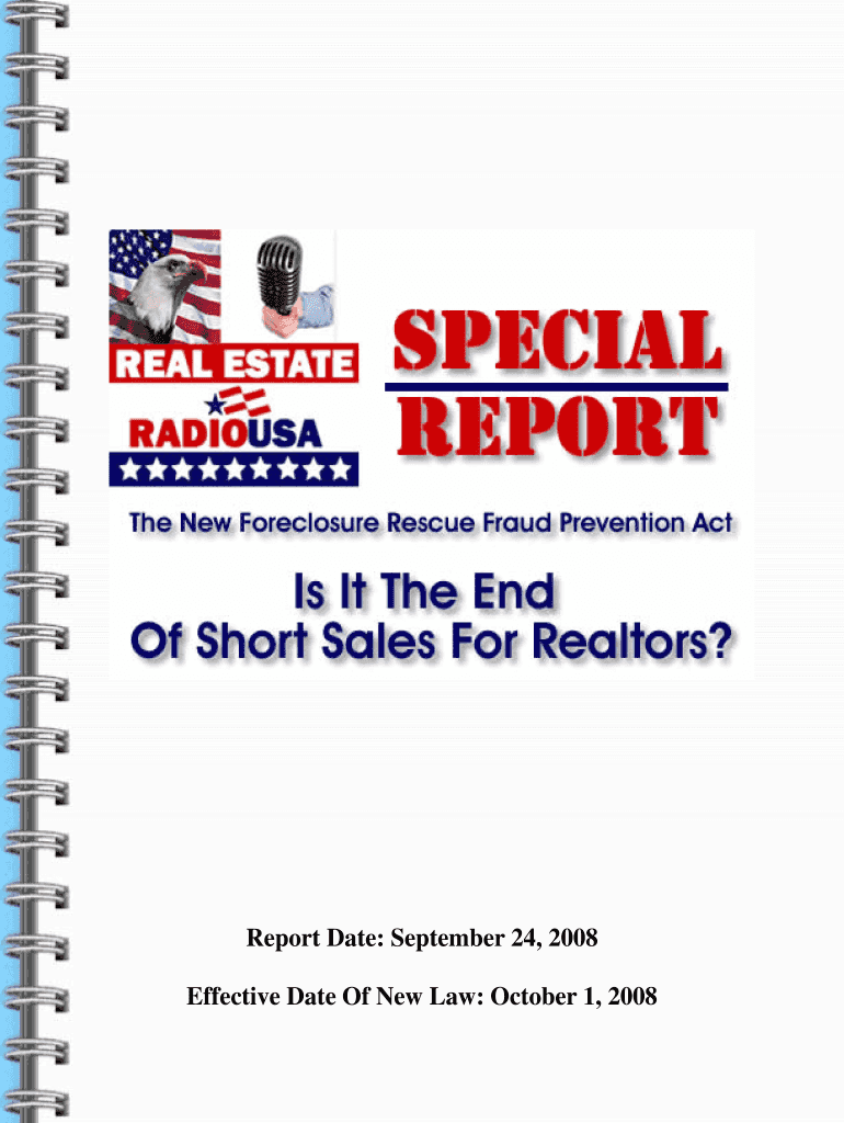 Report Date: September 24, 2008, Effective Date Of New Law: October 1, 2008, If you're a real estate investor, real estate agent or a homeowner in foreclosure, you need to be aware of a new law going