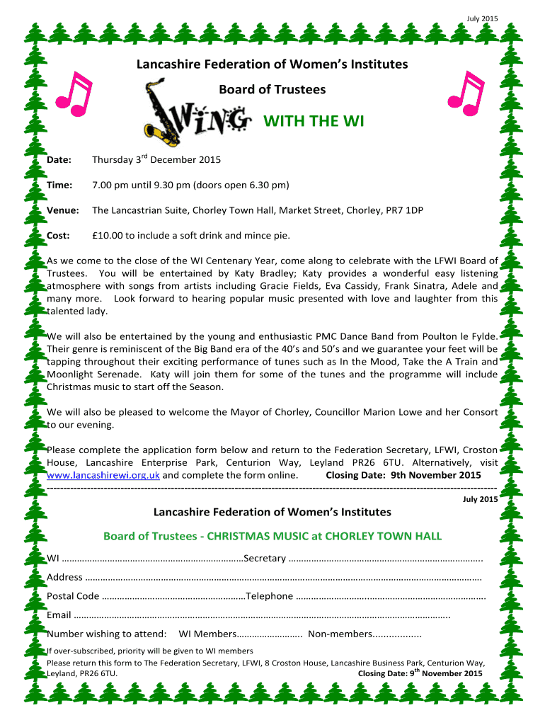 July 2015 Lancashire Federation of Women's Institutes Board of Trustees WITH THE WI Date: Thursday 3rd December 2015 Time: 7.00 pm until 9.30 pm (doors open 6.30 pm) Venue: The Lancastrian Suite,