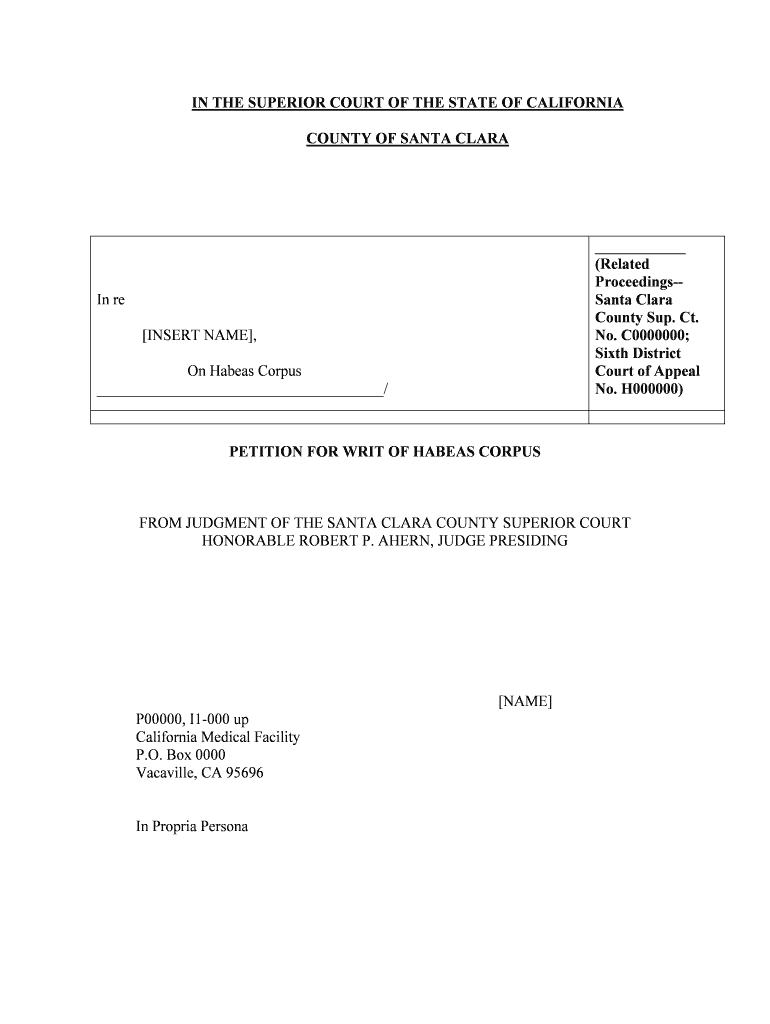 IN THE SUPERIOR COURT OF THE STATE OF CALIFORNIA COUNTY OF SANTA CLARA (Related Proceedings Santa Clara County Sup. Ct. No. C0000000; Sixth District Court of Appeal No. H000000) In re INSERT NAME,