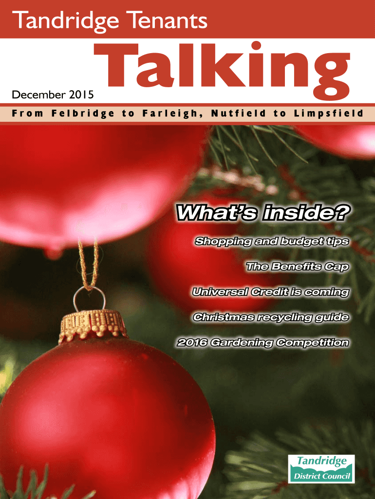 Tandridge Tenants Talking December 2015 From Elmbridge to Raleigh, Outfield to Limps field What's inside? Shopping and budget tips The Benefits Cap Universal Credit is coming Christmas recycling guide