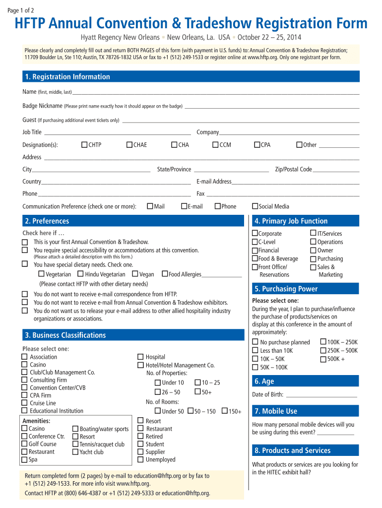 Page 1 of 2 FTP Annual Convention & Trade show Registration Form Hyatt Regency New Orleans, La. USA October 22 25, 2014 Please clearly and completely fill out and return BOTH PAGES of this form (with