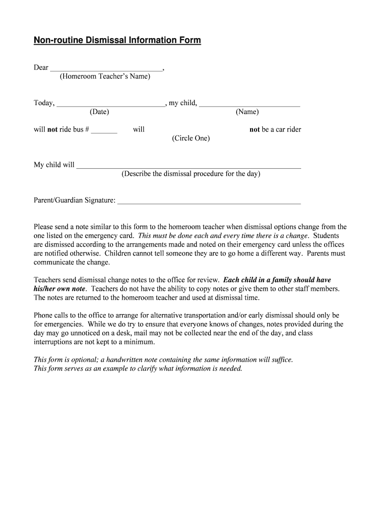 Nonroutine Dismissal Information Form Dear, (Homeroom Teachers Name) Today, my child, (Date) (Name) will not ride bus # will (Circle One) not be a car rider My child will (Describe the dismissal procedure