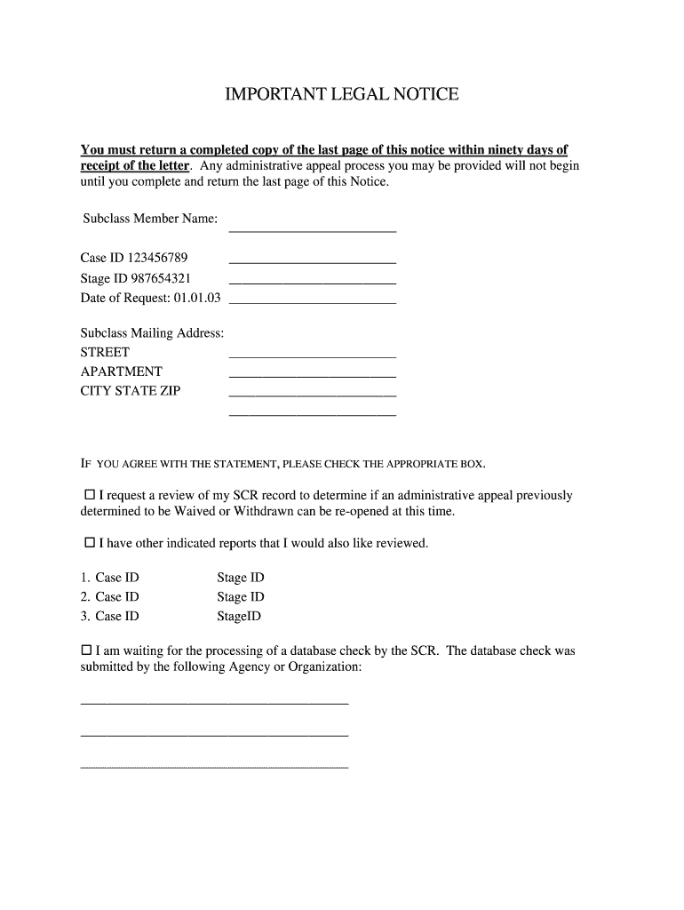 IMPORTANT LEGAL NOTICE You must return a completed copy of the last page of this notice within ninety days of receipt of the letter. Any administrative appeal process you may be provided will not