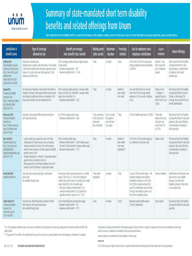 Summary of state mandated short term disability benefits and related offerings from UNM State mandated short term disability benefits are required for all employers with employees working in states