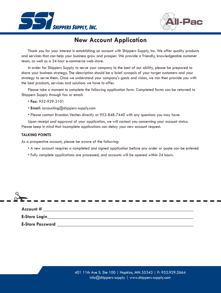 New Account Application Thank you for your interest in establishing an account with Shippers Supply, Inc. We offer quality products and services that can help your business grow and prosper. We provide