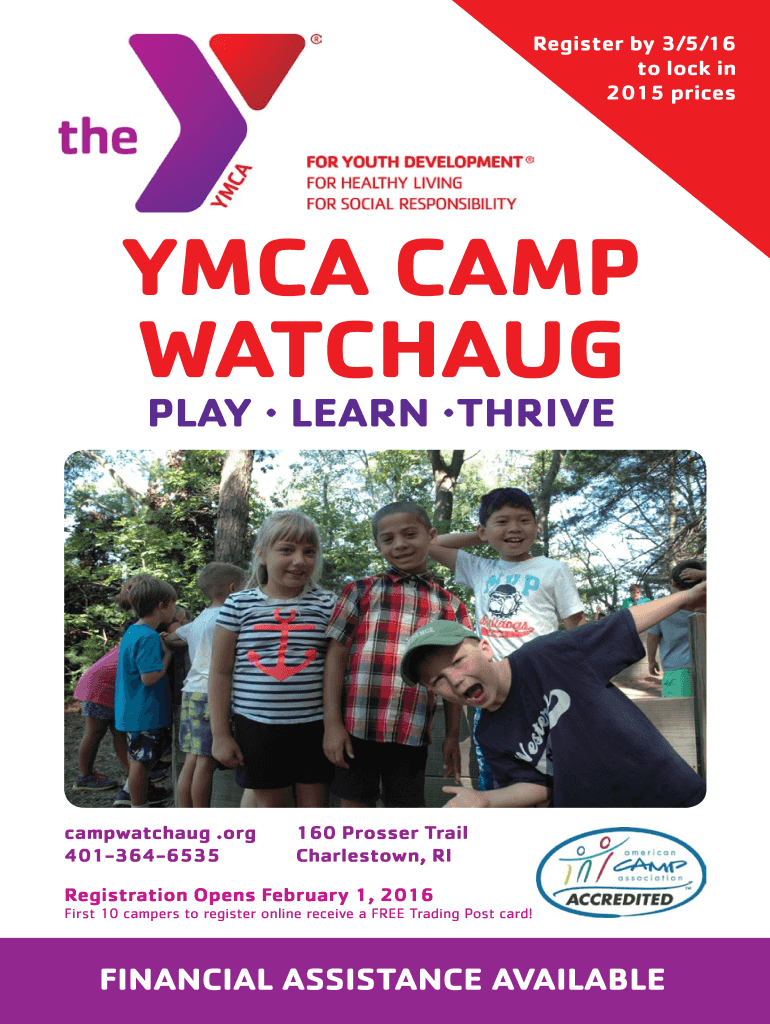 Register by 3/5/16 to lock in 2015 prices YMCA CAMP WATCH AUG PLAY LEARN To thrive campwatchaug .org 4013646535 160 Prosper Trail Charlestown, RI Registration Opens February 1, 2016, First 10 campers