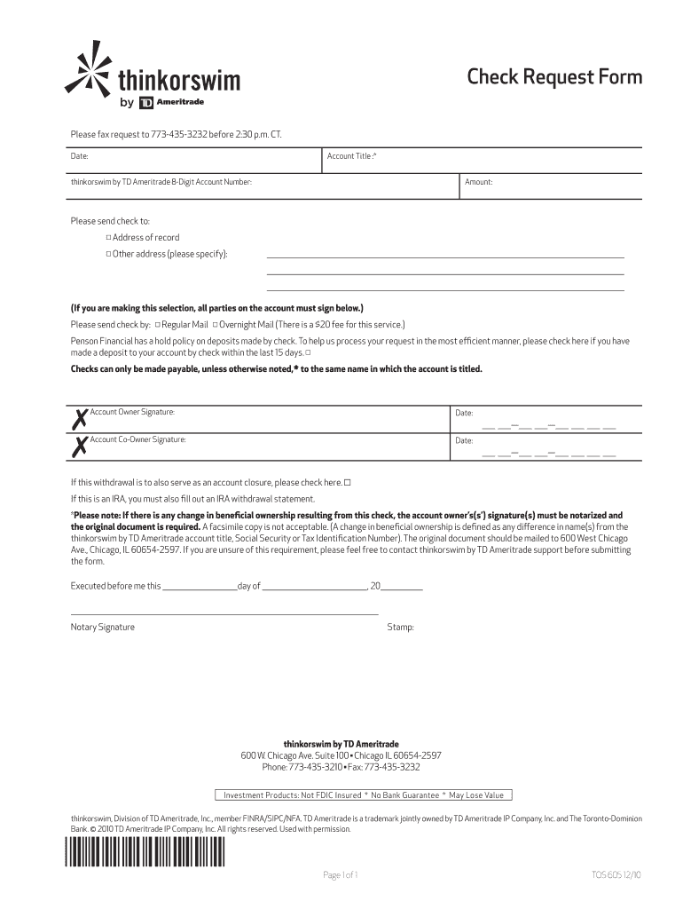 Check Request Form Please fax request to 7734353232 before 2:30 p.m. CT. Date: Account Title :* thinkorswim by TD Ameliorate 8Digit Account Number: Amount: Please send check to: N Address of record