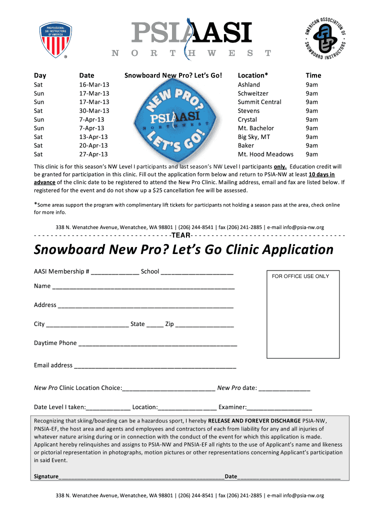 Day Date Sat Sun Sat Sat Sat 16Mar13 17Mar13 30Mar13 7Apr13 13Apr13 20Apr13 27Apr13 Snowboard New Pro? Let's Go! Location* Time Ashland Schweitzer Summit Central Stevens Crystal Mt. Bachelor Big Sky,