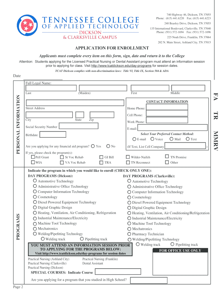 Application Packet and Checklist Attention: Students applying for the Licensed Practical Nursing or Dental Assistant program must attend an information session prior to applying for class. Visit http://www.tcatdickson.edu/dayprograms