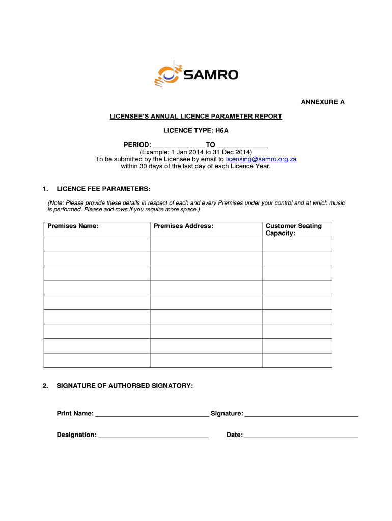 Appendix a licensees annual license parameter report license type: h6a period: to (example: 1 Jan 2014 to 31 DEC 2014)