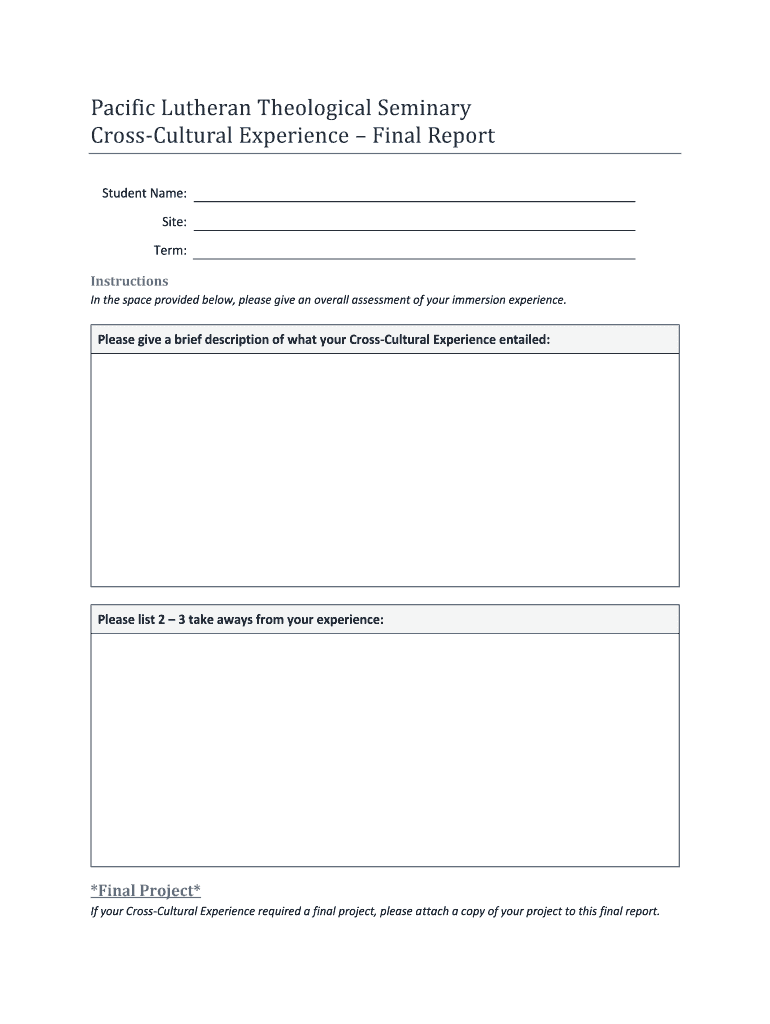 Pacific Lutheran Theological Seminary Transcultural Experience Final Report Student Name: Site: Term: Instructions In the space provided below, please give an overall assessment of your immersion