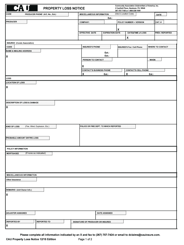 Community Association Underwriters of America, Inc. 2 Canfield Place, Newton, PA 18940 2677577100 or 18002281930 PROPERTY LOSS NOTICE CODE PRODUCER PHONE (A/C, No., Ext.) MISCELLANEOUS INFORMATION