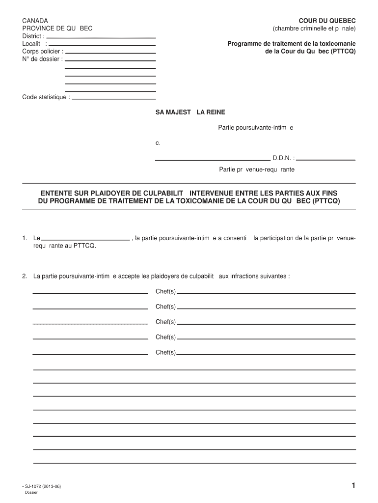 Get the free SJ-1072 2013-06 - Entente sur plaidoyer de culpabilit intervenue entre les parties a...