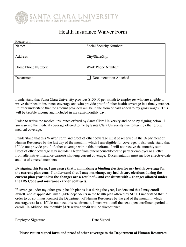 Health Insurance Waiver Form Please print Name: Social Security Number: Address: City/State/Zip: Home Phone Number: Work Phone Number: Department: Documentation Attached I understand that Santa Clara