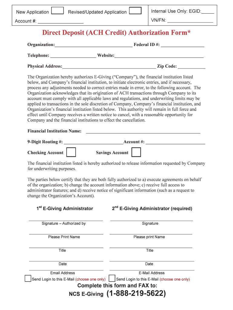 New Application Revised/Updated Application Internal Use Only: ENID: VN/FN: Account #: Direct Deposit (ACH Credit) Authorization Form* Organization: Federal ID #: Telephone: Website: Physical Address: