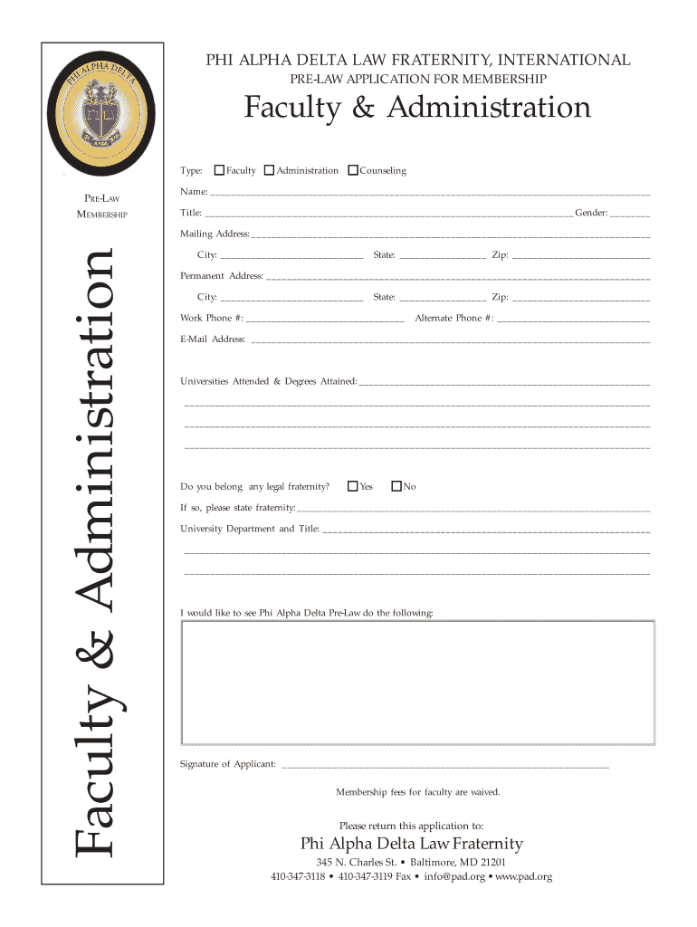PHI ALPHA DELTA LAW FRATERNITY, INTERNATIONAL PRELAW APPLICATION FOR MEMBERSHIP Faculty & Administration Type: PRELAW MEMBERSHIP Faculty Administration Counseling Name: Title: Gender: Faculty & Administration
