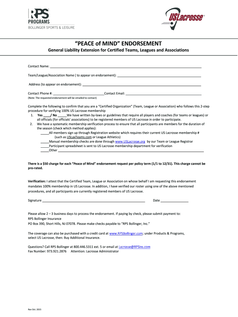 Get the free PEACE of MIND ENDORSEMENT - RPS Bollinger