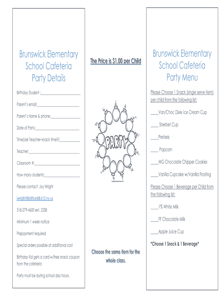 Get the free Brunswick Elementary School Cafeteria Party Details Party Menu - brittonkill k12 ny