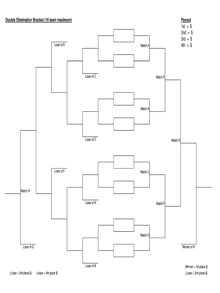 Double Elimination Bracket (16 team maximum)Loser of Payout 1st $ 2nd $ 3rd $ 4th match Closer of Match Closer of Match Match Match H Loser of Match D Loser of Winner of Closer of B (Loser 3rd place