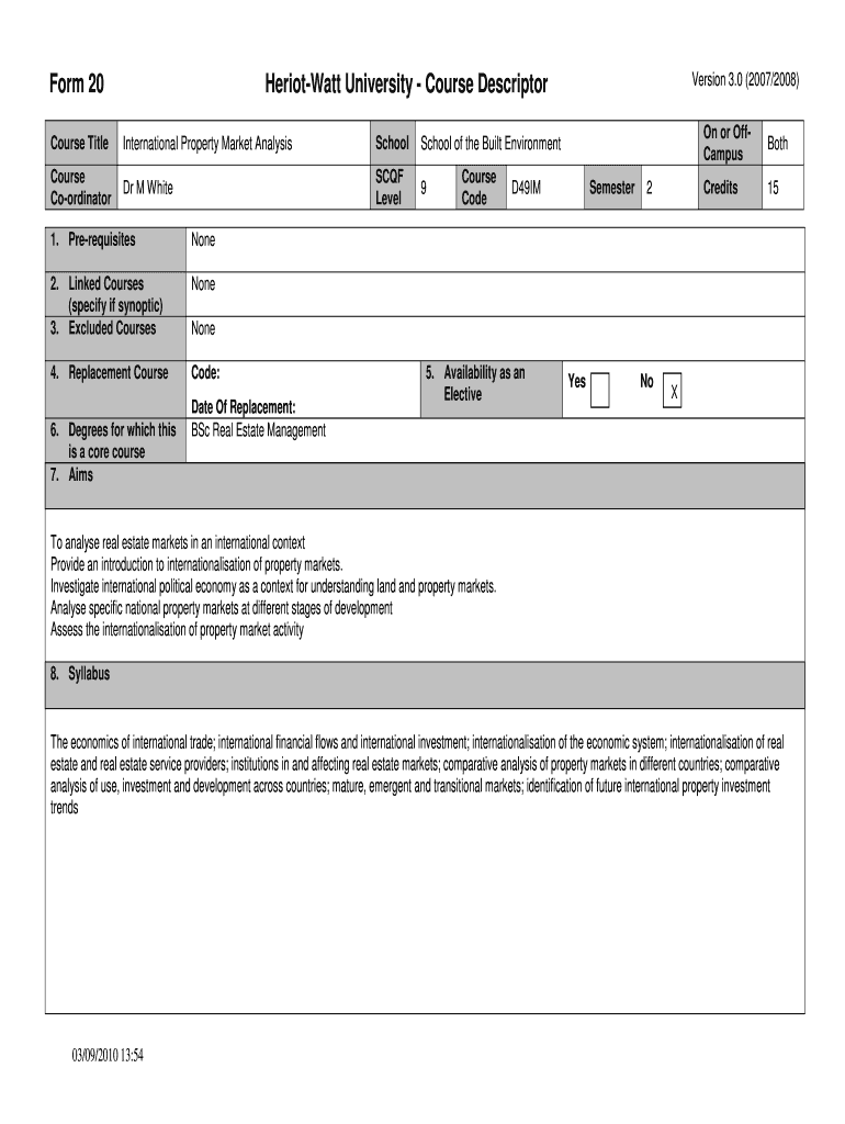 This document outlines the course descriptor for International Property Market Analysis offered by Heriot-Watt University, including details about course aims, syllabus, learning outcomes, assessment