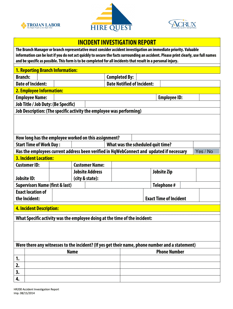 INCIDENT INVESTIGATION REPORT The Branch Manager or branch representative must consider accident investigation an immediate priority. Valuable information can be lost if you do not act quickly to